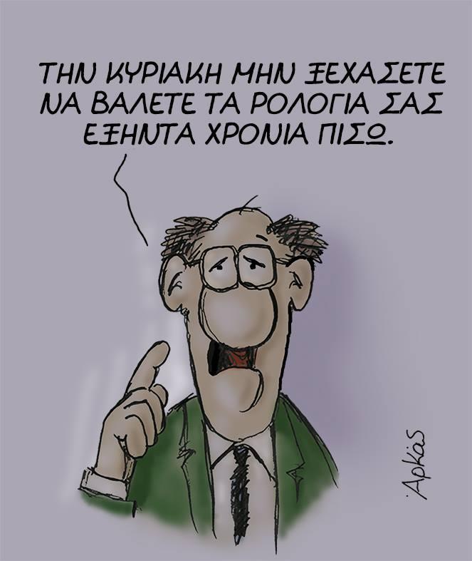 Επανεμφάνιση που έγινε viral. Εξαίρεση στην απόφασή του να μην ανέβουν ξανά νέα σκίτσα του στο Facebook έκανε ο Αρκάς , ανήμερα της επετείου του "Οχι" και ενόψει της αλλαγής της ώρας την ερχόμενη Κυριακή.