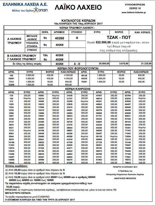 Δείτε την κλήρωση της Τετάρτης 19/04 του Λαϊκού Λαχείου (Τζακ Ποτ)