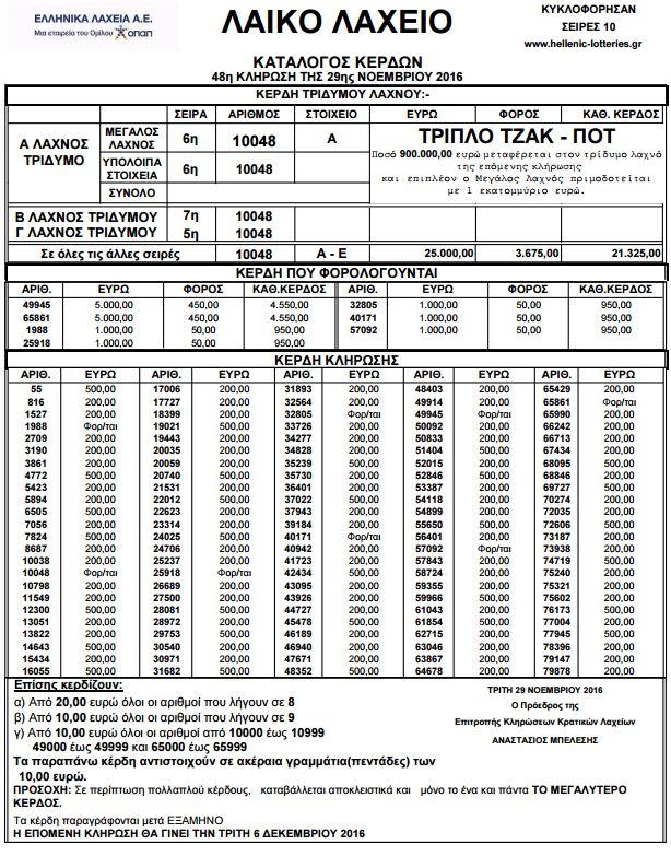 Το λαχείο με τον αριθμό 10048, σειρά 6η με στοιχείο Α, δεν πωλήθηκε. Ακολουθεί ο πίνακας με τα αναλυτικά αποτελέσματα: