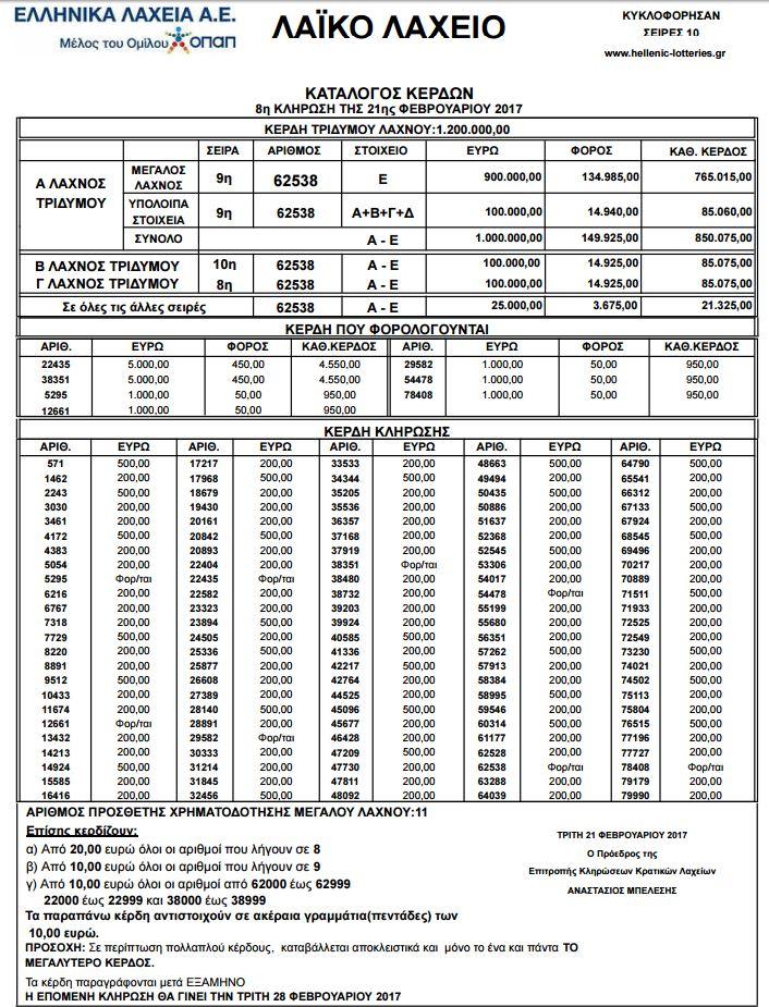 Βρέθηκε τυχερός στη σημερινή κλήρωση, Τρίτη 21 Φεβρουαρίου 2017, για το Λαϊκό Λαχείο: