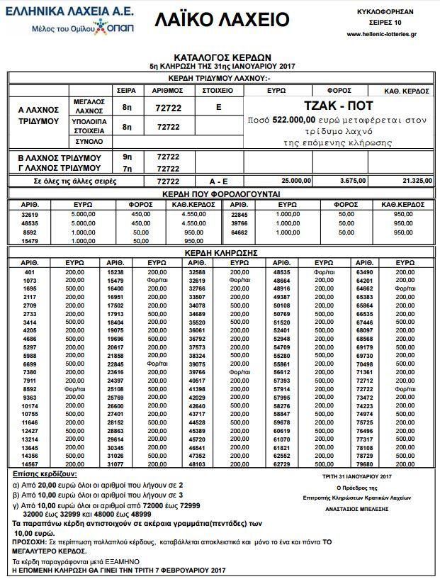 Στην πρώτη κατηγορία, ο αριθμός που κληρώθηκε είναι 72722, σειρά 8η και στοιχείο Ε.