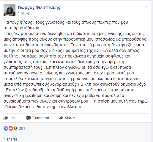 Μέσω Facebook αποφάσισε να απαντήσει και πάλι ο Γιώργος Φιλιππάκης θέλοντας να ξεκαθαρίσει την θέση του για την περιβόητη ανάρτησή του σχετικά με τον Γιάννη Στουρνάρα και την τρομοκρατική επίθεση στον Λουκά Παπαδήμο.