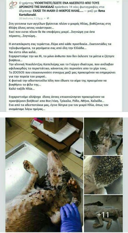 Έχασε τη μάχη με τη ζωή, ο μικρός Ηλίας που χθες, 21 Ιουλίου χρειαζόταν βοήθεια από σκύλο αιμοδότη, για να σωθεί. Στην θλίψη βυθίστηκαν όλοι όσοι βοήθησαν το σκυλάκι στις τελευταίες του μέρες, προσφέροντας όλα όσα μπορούσαν.
