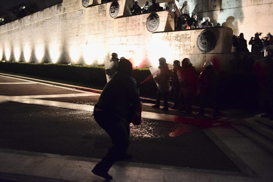 Ομάδες άγνωστων ατόμων έριξαν βόμβες μολότοφ, μάρμαρα, μπογιές και πέτρες προς τις αστυνομικές δυνάμεις των ΜΑΤ που ήταν μπροστά από τον Αγνωστο Στρατιώτη, οι οποίες προσπάθησαν να τους απωθήσουν κάνοντας περιορισμένη χρήση χημικών και χειροβομβίδων κρότου λάμψης.
