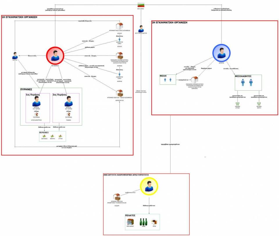 • η δράση δύο εγκληματικών οργανώσεων, με ιεραρχική δομή και διακριτούς ρόλους, που δραστηριοποιούνταν στην παράνομη εισαγωγή μεγάλων ποσοτήτων αιθυλικής αλκοόλης από την Βουλγαρία,