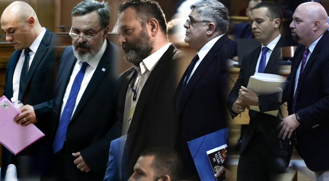 Παρόντες στη δικαστική αίθουσα οι πρώην βουλευτές Α. Ματθαιόπουλος, καταδικασμένος για διεύθυνση εγκληματικής οργάνωσης και Κ. Μπαρμπαρούσης, καταδικασμένος για ένταξη σε εγκληματική οργάνωση.