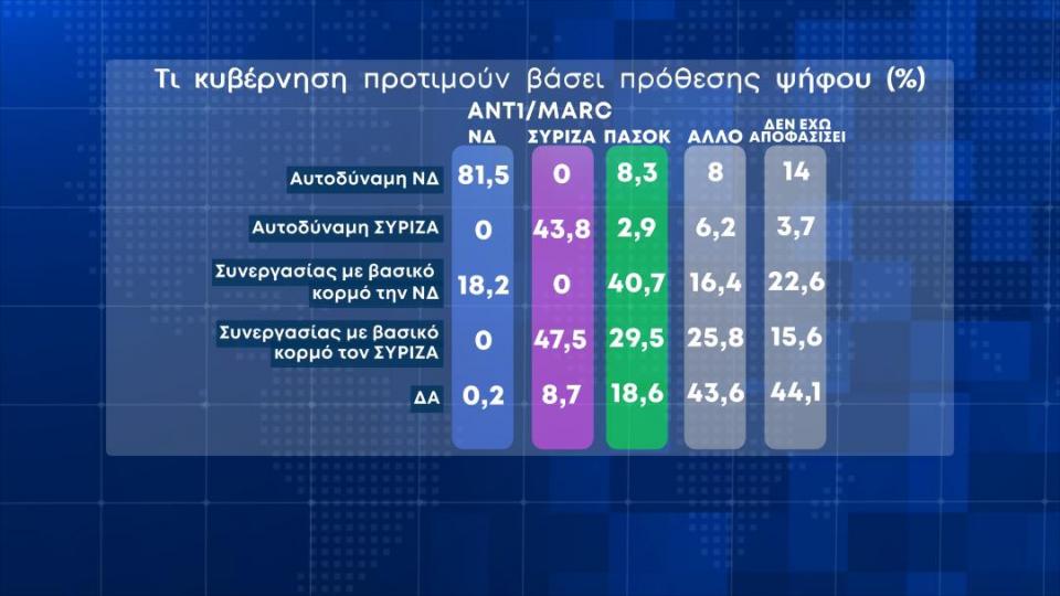 Σχετικά με το τι κυβέρνηση προτιμούν απάντησαν το 31,1% ότι θέλουν αυτοδύναμη κυβέρνηση της Νέας Δημοκρατίας, το 12,5% αυτοδυναμία ΣΥΡΙΖΑ ενώ το κυβέρνηση συνεργασίας με βασικό κορμό τη Νέα Δημοκρατία προτιμά το 21,8% και με βασικό κορμό τον ΣΥΡΙΖΑ, το 21,8%.