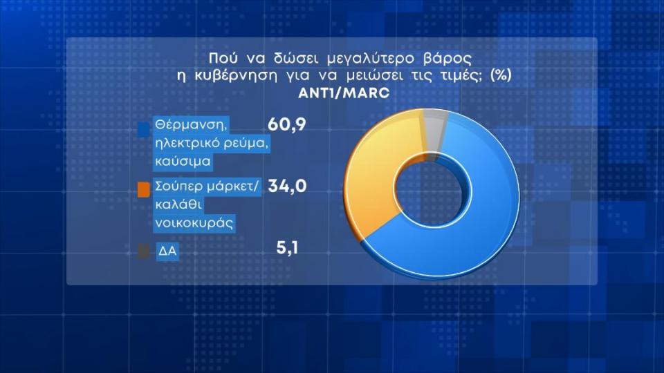 Οι ερωτηθέντες απάντησαν ότι το βάρος της η κυβέρνηση πρέπει να το ρίξει στη θέρμανση, το ηλεκτρικό ρεύμα και τα καύσιμα, όπως σχολίασε ο κ. Γεράκης, ο "ενεργός πληθυσμός" είναι εκείνος που τείνει προς αυτή την κατεύθυνση, με τους μεγαλύτερους σε ηλικίας ανθρώπους να αναφέρουν πως η κυβέρνηση θα πρέπει να έχει προτεραιότητα το σουπερ μάρκετ και το καλάθι της νοικοκυράς με ποσοστό 34%.