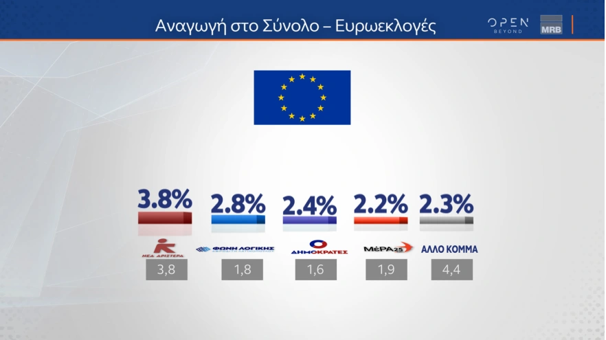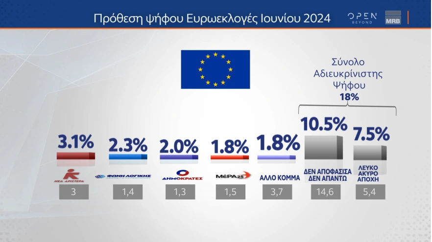 Μεγάλο προβάδισμα καταγράφει η Νέα Δημοκρατία στη μεγάλη δημοσκόπηση της MRB το πρώτο μέρος της οποίας προβλήθηκε στο κεντρικό δελτίο ειδήσεων του OPEN, 24 ημέρες πριν από τις ευρωεκλογές. H ΝΔ ανεβάζει τα ποσοστά της και διευρύνει τη διαφορά της από τον δεύτερο ΣΥΡΙΖΑ σε σχέση με την προηγούμενη μέτρηση της ίδιας εταιρείας. Ο ΣΥΡΙΖΑ διατηρεί τη δεύτερη θέση, με το ΠΑΣΟΚ να μένει τρίτο, αλλά με άνοδο και μειώνει τη διαφορά.