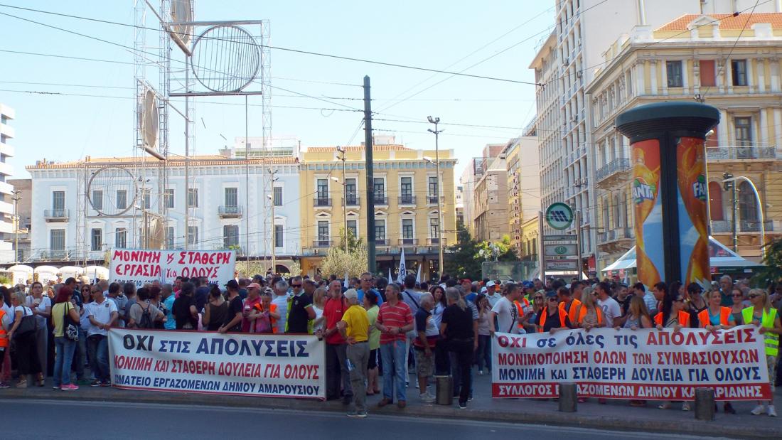 Δύο μεγάλες συγκεντρώσεις συμβασιούχων των δήμων βρίσκονται σε εξέλιξη στο κέντρο της Αθήνας. Η μία πραγματοποιείται από την ΠΟΕ-ΟΤΑ έξω από τα γραφεία της στην πλατεία Καραϊσκάκη, στο Μεταξουργείο, και η άλλη από το Συνδικάτο ΟΤΑ Αττικής στην πλατεία Ομονοίας.