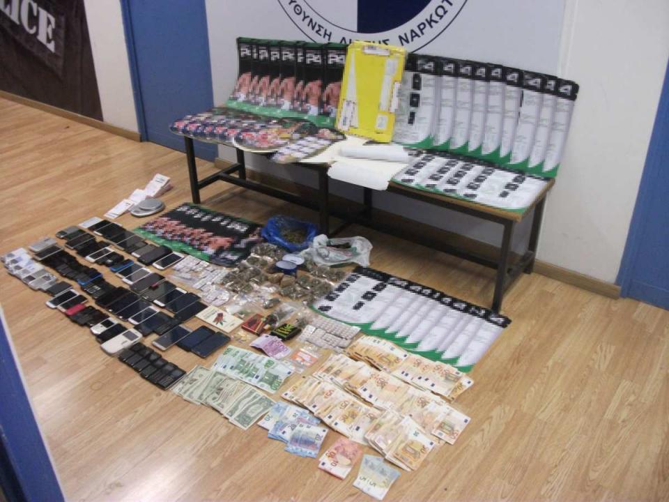 Ακόμα κατασχέσαμε, μεταξύ άλλων: 44 χαρτόνια διαστάσεων 27,5 cm x 40.5 cm, εμποτισμένα με κοκαΐνη, 9 πολύχρωμα χάρτινα ημερολόγια διαστάσεων 41,5 cm Χ 29,5 cm, εμποτισμένα με κοκαΐνη {μετά την κατάλληλη διαδικασία επεξεργασίας και προσμίξεων, η ποσότητα της κοκαΐνης θα ξεπερνούσε τα 15 κιλά, ποσότητες κοκαΐνης και ακατέργαστης κάνναβης, 232 δισκία διάφορων φαρμακευτικών σκευασμάτων, 10 ηλεκτρονικές ζυγαριές ακριβείας, ένα Ι.Χ. αυτ-το, το χρηματικό ποσό των 35.635 ευρώ και 1.545 δολαρίων Η.Π.Α., 5 χρυσές λίρες Αγγλίας, πλήθος αποδείξεων πληρωμής από δελτία του Ο.Π.Α.Π. για την νομιμοποίηση των εσόδων τους, δύο πλαστικές κυλινδρικές συσκευασίες, οποίες περιείχαν σκόνη σε μορφή νιφάδων, άγνωστης χημικής σύστασης, 52 συσκευές κινητής τηλεφωνίας, πλήθος καρτών SIM, και επτά αποδείξεις καταθέσεων τράπεζας.