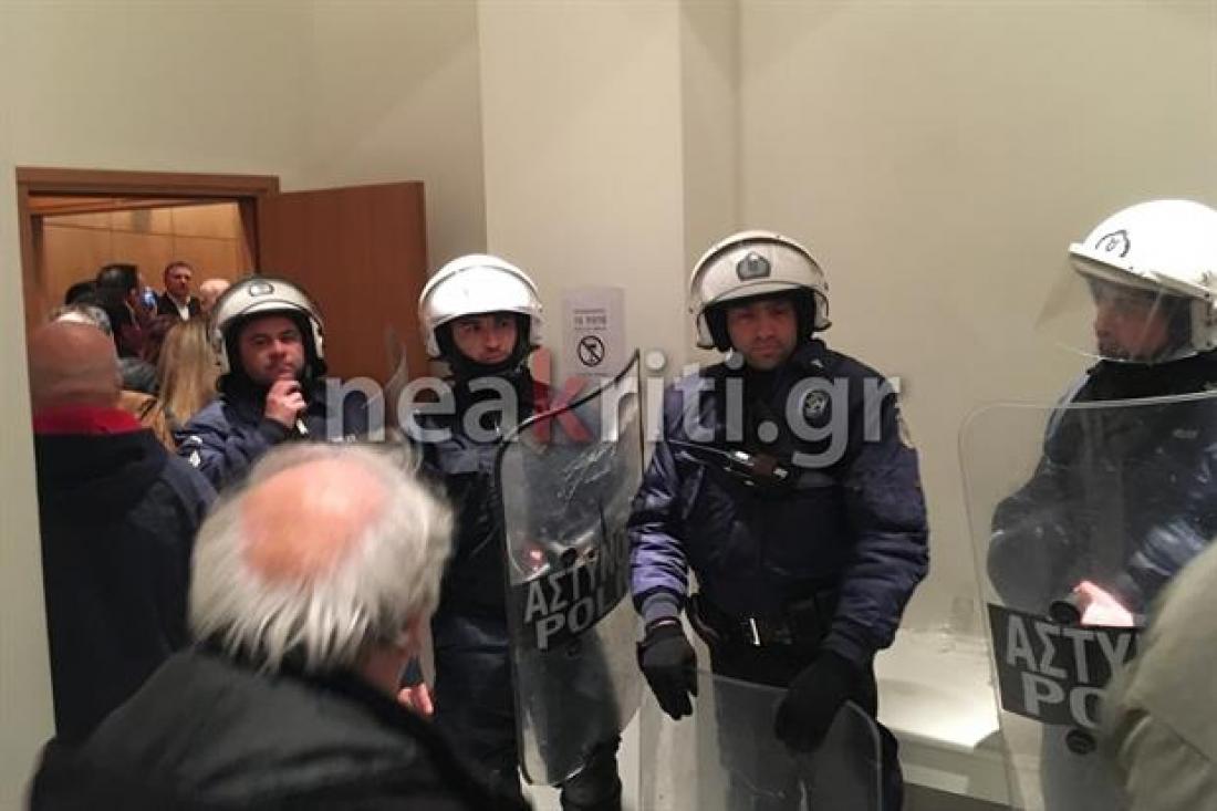 Η ένταση κλιμακώθηκε επικίνδυνα κατά τη στιγμή που οι διαδηλωτές, οι οποίοι δεν σταμάτησαν ούτε λεπτό να φωνάζουν συνθήματα, προσπάθησαν να μπουν στο εσωτερικό της αίθουσας «Καστελλάκη» όπου βρισκόταν σε εξέλιξη η εκδήλωση και ο κ. Πετρόπουλος ήταν ήδη στο βήμα. Λίγο αργότερα, η κατάσταση αποκλιμακώθηκε, ενώ οι διαδηλωτές αποχώρησαν από τον χώρο, με την εκδήλωση να συνεχίζεται κανονικά. Ιδιαίτερα αυξημένη πάντως ήταν η παρουσία της αστυνομίας.