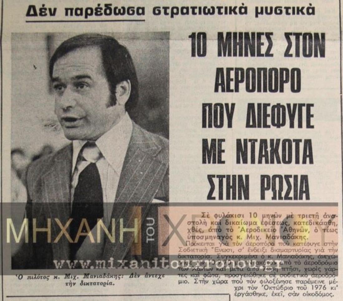 Στις 9 Σεπτεμβρίου 1970 ο ιπτάμενος υποσμηναγός Μιχάλης Μανιαδακης που ήταν χαρακτηρισμένος ως αντιφρονών από το καθεστώς των συνταγματαρχών, διέφυγε στη Σοβιετική Ένωση με μια ντακότα. Η χούντα αιφνιδιάστηκε και δεν δίστασε να ζητήσει από τους Τούρκους να καταρρίψουν το αεροπλάνο. Οι Τούρκοι δίστασαν. Ο υποσμηναγός Μανιαδακης μετά από περιπετειώδη πτήση έφθασε στη Σεβαστούπολη. Η χούντα αποσιώπησε την είδηση. Οι πολίτες δεν την διάβασαν ποτέ. Οι αξιωματικοί του καθεστώτος προσπάθησαν να τον παρουσιάσουν ως ψυχοπαθή.