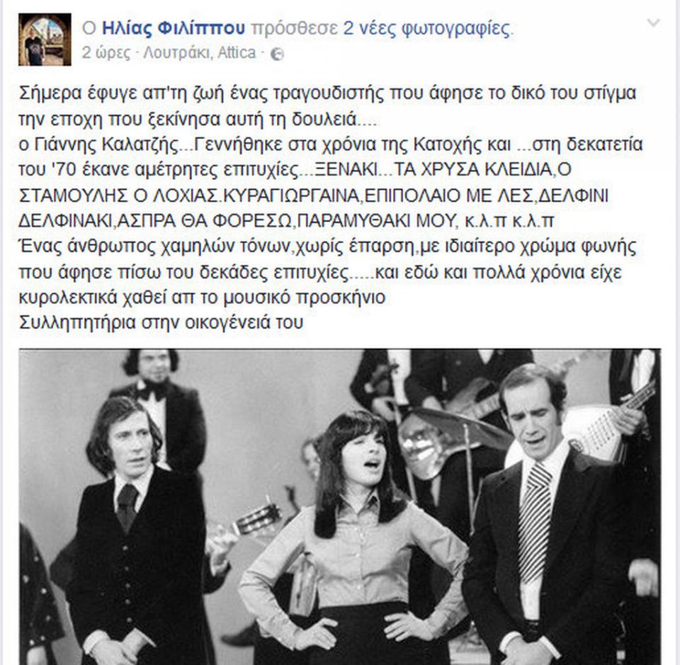 Την είδηση ανέβασε στο facebook ο γνωστός στιχουργός Ηλίας Φιλίππου, ο οποίος και ανέφερε: