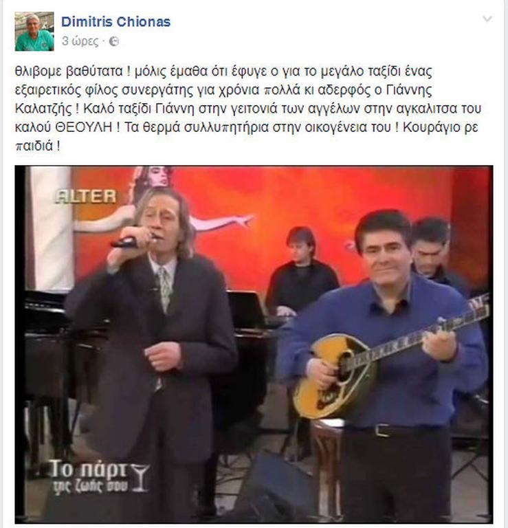 «θλίβομαι βαθύτατα ! μόλις έμαθα ότι έφυγε ο για το μεγάλο ταξίδι ένας εξαιρετικός φίλος συνεργάτης για χρόνια πολλά κι αδερφός ο Γιάννης Καλατζής ! Καλό ταξίδι Γιάννη στην γειτονιά των αγγέλων στην αγκαλιτσα του καλού ΘΕΟΥΛΗ ! Τα θερμά συλλυπητήρια στην οικογένεια του ! Κουράγιο ρε παιδιά !"