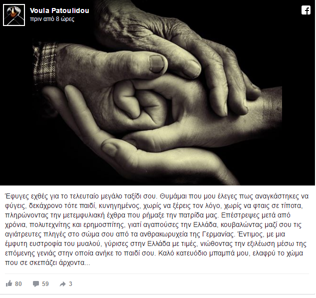 «Έφυγες εχθές για το τελευταίο μεγάλο ταξίδι σου. Θυμάμαι που μου έλεγες πως αναγκάστηκες να φύγεις, δεκάχρονο τότε παιδί, κυνηγημένος, χωρίς να ξέρεις τον λόγο, χωρίς να φταις σε τίποτα, πληρώνοντας την μετεμφυλιακή έχθρα που ρήμαξε την πατρίδα μας. Επέστρεψες μετά από χρόνια, πολυτεχνίτης και ερημοσπίτης, γιατί αγαπούσες την Ελλάδα, κουβαλώντας μαζί σου τις αγιάτρευτες πληγές στο σώμα σου από τα ανθρακωρυχεία της Γερμανίας. Έντιμος, με μια έμφυτη ευστροφία του μυαλού, γύρισες στην Ελλάδα με τιμές, νιώθοντας την εξιλέωση μέσω της επόμενης γενιάς στην οποία ανήκε το παιδί σου. Καλό κατευόδιο μπαμπά μου, ελαφρύ το χώμα που σε σκεπάζει άρχοντα...».