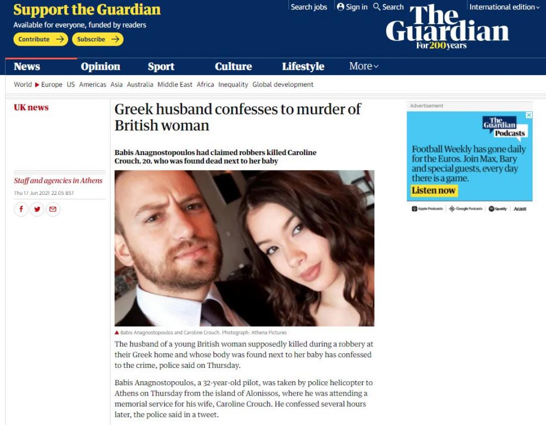 Ειδικότερα, ο «Guardian» έγραψε: «Ο έλληνας σύζυγος ομολόγησε την δολοφονία της βρετανίδας συζύγου του».