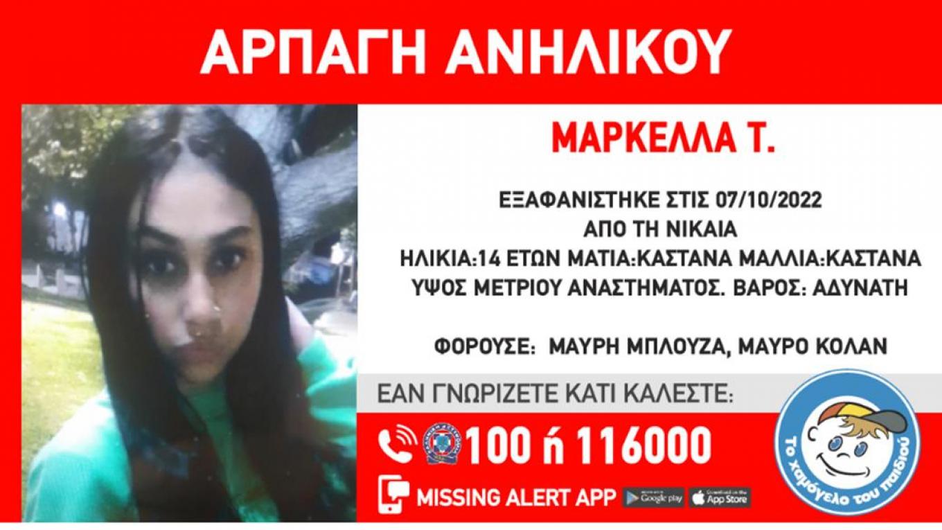 Σύμφωνα με τα όσα ανακοίνωσε «Το Χαμόγελο του Παιδιού» η Μαρκέλλα Τ. απήχθη παρά την θέλησή της από ενήλικο άνδρα, από τη Νίκαια, στις 21:30 το βράδυ της Παρασκευής.