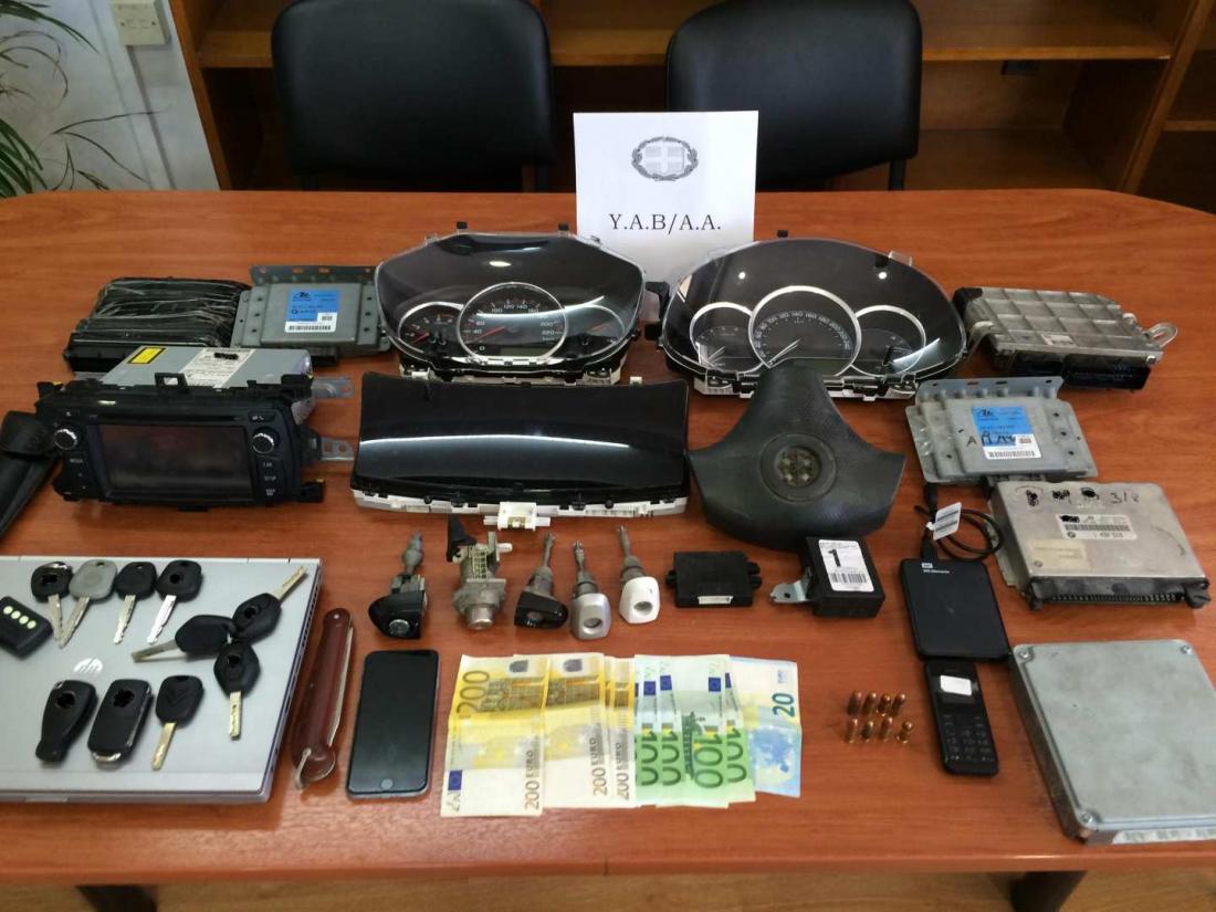 εξωτερικές κλειδαριές αυτοκινήτων, πλήθος υπεύθυνων δηλώσεων μεταβίβασης αυτοκινήτων, οκτώ φυσίγγια, 1.660 ευρώ και μικροποσότητα ναρκωτικών ουσιών.