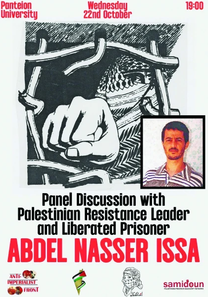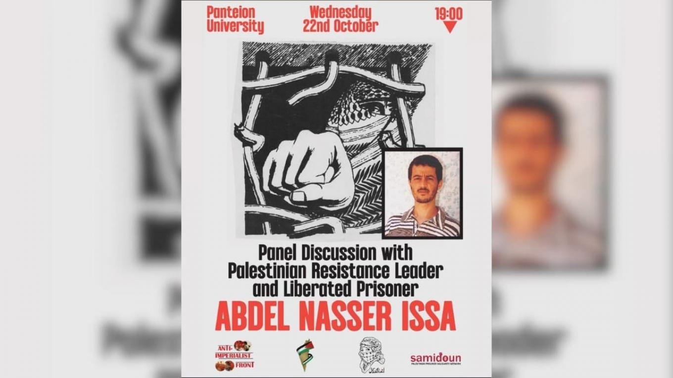 Καταδικασμένος από τις ισραηλινές αρχές ως τρομοκράτης και ηγετικό μέλος της Χαμάς, ο ισοβίτης που αφέθηκε ελεύθερος μετά από ανταλλαγή Ισραηλινών ομήρων με Παλαιστίνιους κρατούμενους, κλήθηκε σε εκδήλωση στο Πάντειο Πανεπιστήμιο ως ομιλητής! Ο λόγος για τον Αμπντέλ Νάσερ Ίσα, ο οποίος, σύμφωνα με ισραηλινά μέσα ενημέρωσης, επέβλεπε την τρομοκρατική δραστηριότητα της Χαμάς στη Δυτική Όχθη.