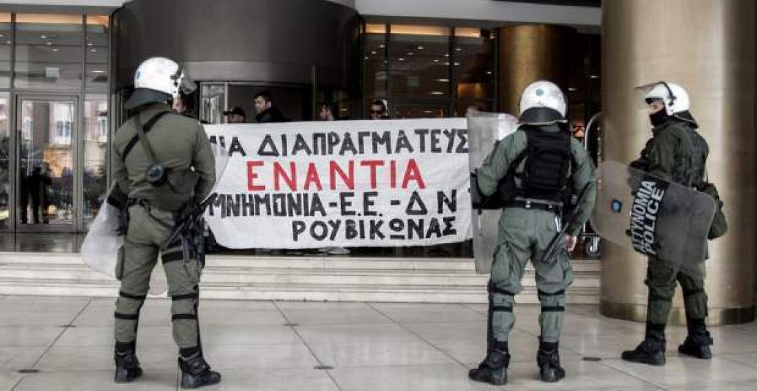 "Παρέμβαση του Ρουβίκωνα τώρα στήν εκδήλωση του Τμήματος Οικονομικής Πολιτικής του ΣΥΡΙΖΑ (με ομιλητές τον υπουργό Οικονομικών, και τον Υπουργό Οικονομίας στο ξενοδοχείο ΤΙΤΑΝΙΑ.