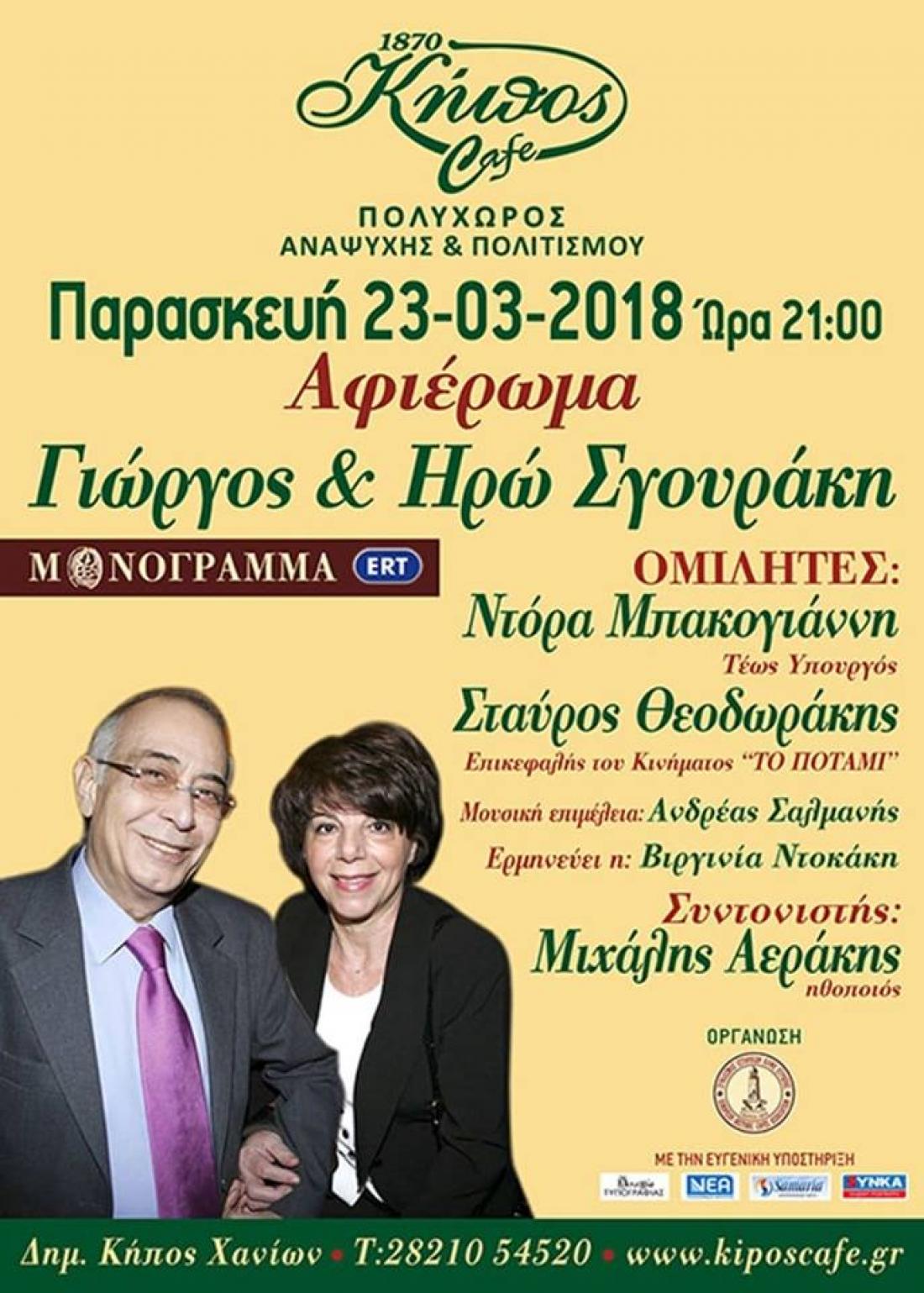 Αφιερωμένη στους Γιώργο και Ηρώ Σγουράκη και την εκπομπή “Μονόγραμμα” που από κοινού δημιούργησαν θα είναι η εκδήλωση που διοργανώνει ο Σύνδεσμος Ιστορικών Καφέ Ευρώπης στο καφέ «Κήπος» την Παρασκευή 23 Μαρτίου στις 9 το βράδυ.