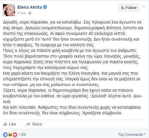 Με αφορμή τη συνέντευξη του ειδικού συμβούλου του πρωθυπουργού, Νίκου Καρανίκα στο Down Town όπου μιλά για την Ελένη Μενεγάκη και τη διάψευση του στη συνέχεια, η Έλενα Ακρίτα αναφέρεται το γεγονός μέσω του προσωπικού της λογαριασμού στο facebook με καυστικά σχόλια...