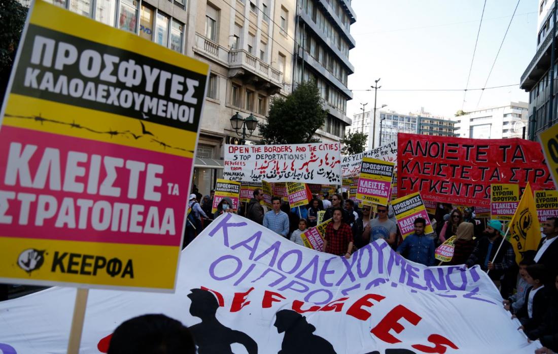 Οι διαδηλωτές φωνάζουν συνθήματα κατά των ρατσιστικών συμπεριφορών και της συμφωνίας ΕΕ-Τουρκίας.