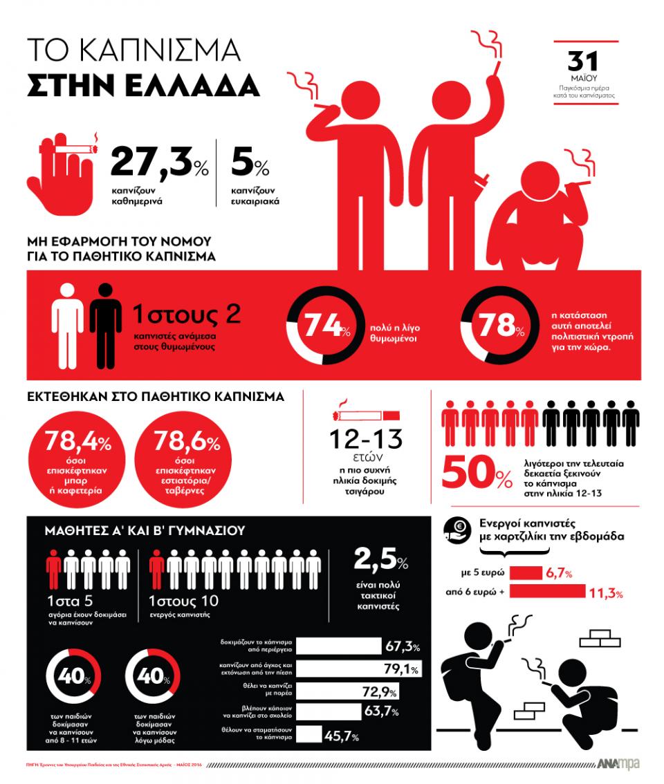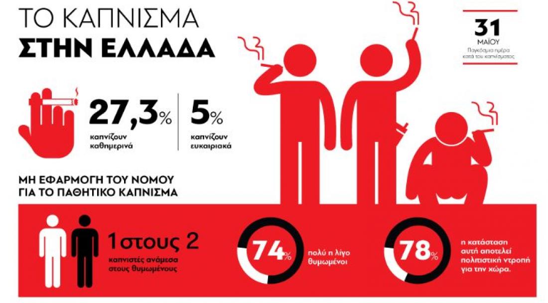 Το κάπνισμα στη χώρα μας μειώνεται σημαντικά, ωστόσο η Ελλάδα κατατάσσεται πρώτη στην Ευρώπη όσον αφορά στην έκθεση των πολιτών της στον καπνό τρίτων. Σύμφωνα με πρόσφατη έρευνα της Εθνικής Στατιστικής Αρχής για την υγεία, το ποσοστό των Ελλήνων που καπνίζουν καθημερινά έχει πέσει στο 27,3 %, ενώ αναφέρεται και ένα 5,2% ευκαιριακά καπνιζόντων.