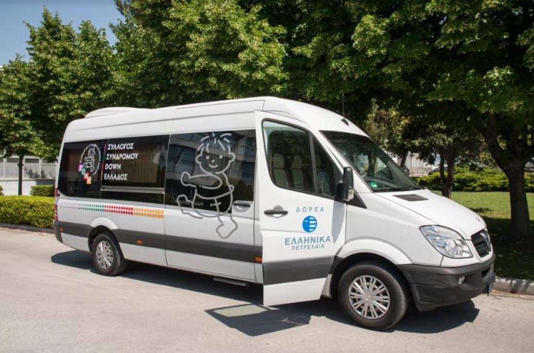 Το ολοκαίνουριο 17θέσιο λεωφορείο, το οποίο προσέφερε ο Όμιλος ΕΛΛΗΝΙΚΑ ΠΕΤΡΕΛΑΙΑ για τις ανάγκες ασφαλούς καθημερινής μετακίνησης των παιδιών του «Συλλόγου Συνδρόμου Down Ελλάδος» στη Θεσσαλονίκη.