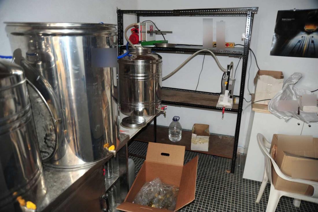 Μάλιστα, το αρχηγικό μέλος της οργάνωσης, είχε εγκαταστήσει σε ειδικά διαμορφωμένο χώρο του σπιτιού του, παράνομο εργαστήριο για την παρασκευή και νόθευση των αλκοολούχων ποτών, στο οποίο βρέθηκε μεγάλη πλαστική δεξαμενή και μικρότερες ανοξείδωτες, σύστημα μετάγγισης με μοτέρ, μηχάνημα εμφιάλωσης, άδεια μπουκάλια, καπάκια, ετικέτες, ταινίες σφράγισης και ποσότητα οινοπνεύματος.