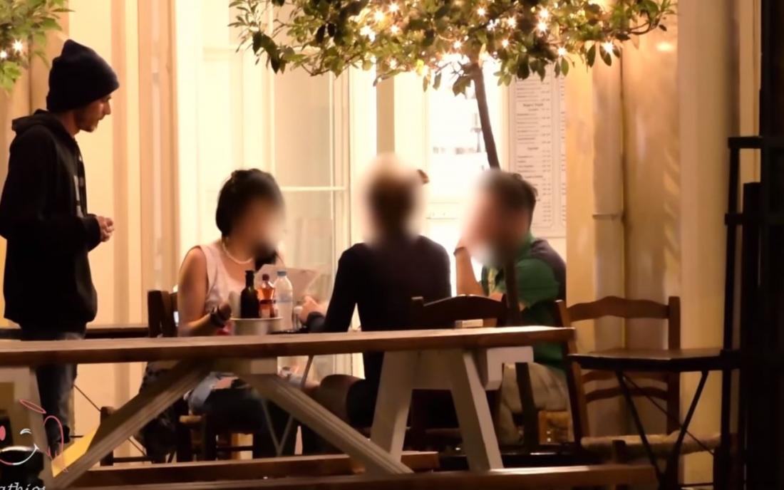Ο άστεγος περνά από παρέες που τρώνε και ζητεί να του δώσουν κάτι να φάει. Όπως θα δείτε οι περισσότεροι τον αντιμετωπίζουν κάνοντας πλάκα λέγοντάς του ότι τα έφαγαν ή ότι δεν έχουν έρθει ακόμη τα φαγητά, ενώ και κάποιοι τον αγνοούν.