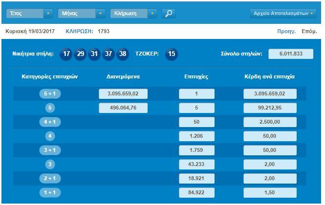 Οι τυχεροί αριθμοί της κλήρωσης ήταν: 17,29, 31, 37, 38 και τζόκερ ο αριθμός 15
