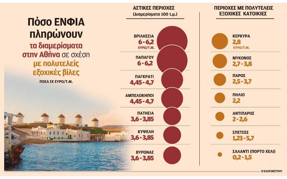 Αυτό προκύπτει από έρευνα της εφημερίδας «Κathimerini», που συγκρίνει το ύψος του ΕΝΦΙΑ μεταξύ διαμερισμάτων 100 τ.μ. σε επιλεγμένες περιοχές της Αττικής και πολυτελών εξοχικών ακινήτων σε δημοφιλείς παραθεριστικούς προορισμούς (με βάση στοιχεία από αγγελίες μεσιτών).