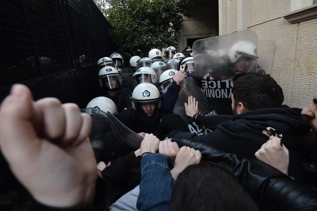 Σύμφωνα με μάρτυρες, ένας από τους διαδηλωτές προσπάθησε να ξεφουσκώσει τα λάστιχα της κλούβας της αστυνομίας.