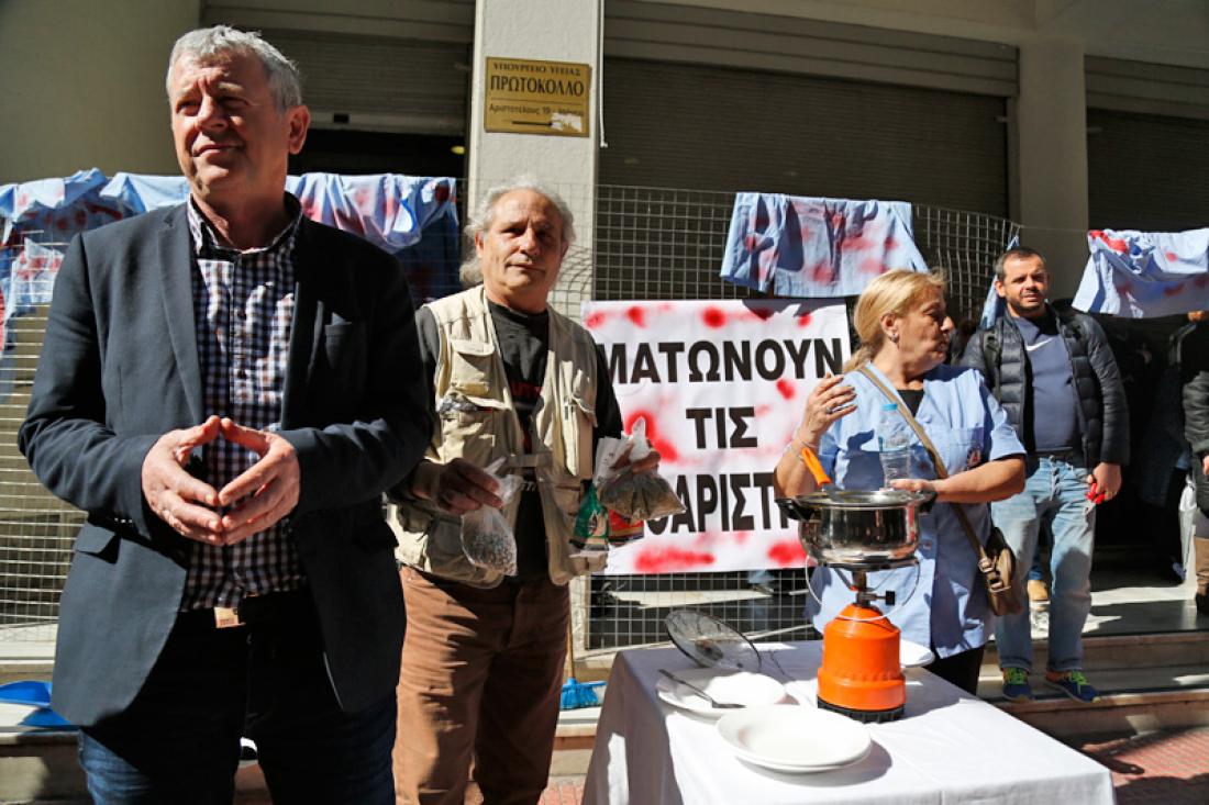 Με σύνθημα «οι καθαρίστριες του υπουργείου Οικονομικών δουλεύουν! Εμείς γιατί όχι;», οι εργολαβικοί εργαζόμενοι στα δημόσια νοσοκομεία συγκεντρώθηκαν έξω από το υπουργείο Υγείας και ζήτησαν συνάντηση με τον υπουργό κ. Ξάνθο.