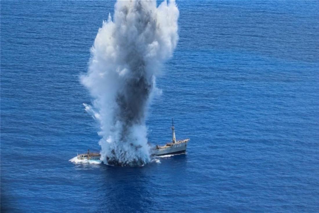 Στο βίντεο οι εκτοξεύσεις πυραύλων από πλοία του Πολεμικού Ναυτικού και με την τορπίλη από υποβρύχιο με στόχο το παροπλισμένο από το 2009 πλοίο μεταφοράς πυρομαχικών και άλλων σχετικών φορτίων «Έβρος».
