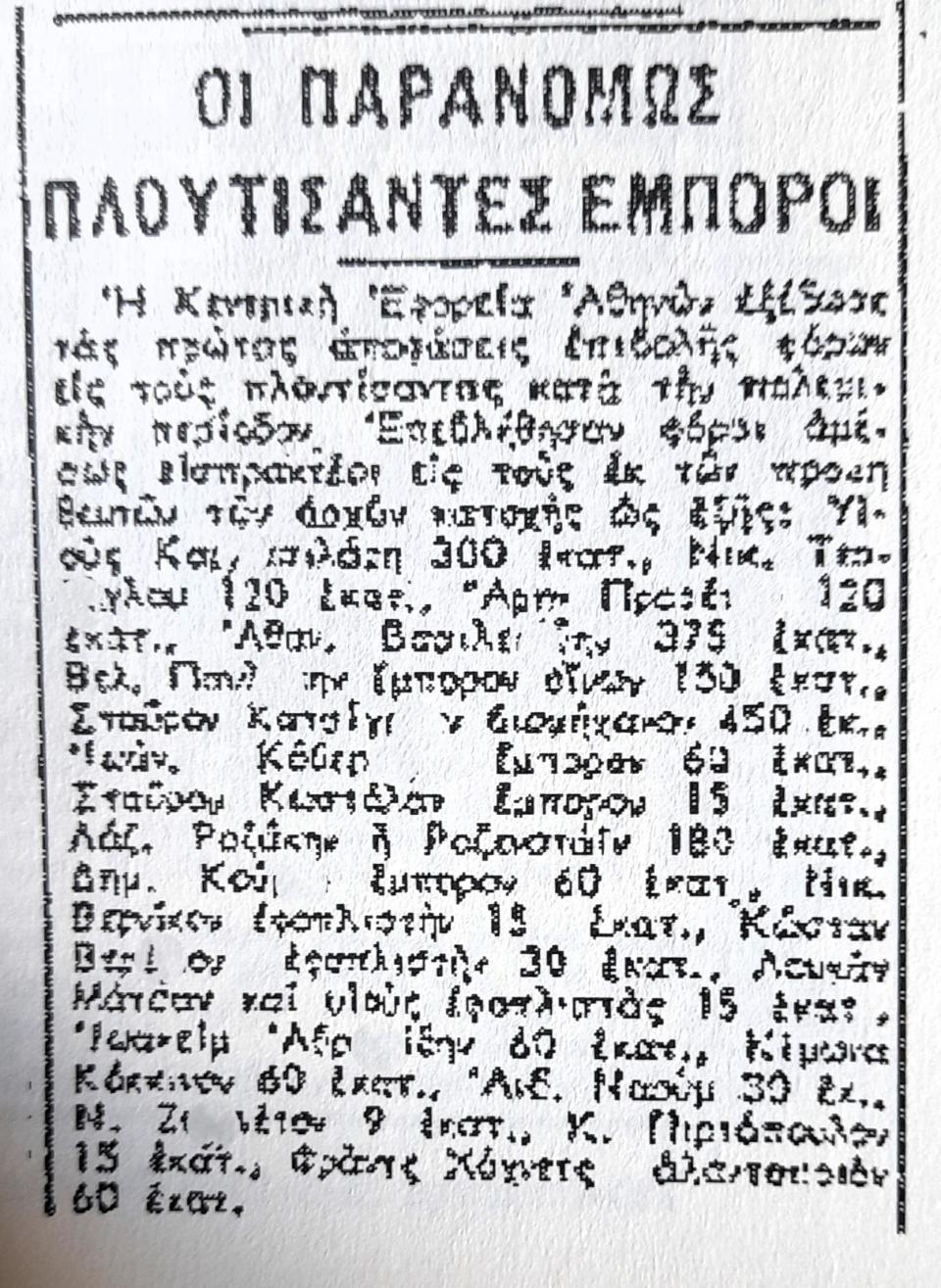 Σε συνθήκες πολέμου και πείνας κάποιοι έκαναν χρυσές δουλειές... Από ένα σύνολο 60.000 αγοραστών, κατά τη διάρκεια της επίμαχης περιόδου, 40.000 αγόρασαν ένα ακίνητο, 10.000 δύο ακίνητα, 5.000 τρία, 3.000 από τέσσερα έως δέκα ακίνητα, 1.500 από ένδεκα έως είκοσι, 400 από 21 έως 50 ακίνητα και 100 από 51 και πάνω! Από αυτήν την ιδιότυπη πυραμίδα αποθησαύρισης κέρδους πάνω στις ανάγκες επιβίωσης απελπισμένων ανθρώπων, προκύπτει ότι 5.000 Έλληνες βγήκαν από τον πόλεμο αισθητά πλουσιότεροι, έχοντας στην κατοχή τους από τέσσερα έως και 50 και πλέον ακίνητα!