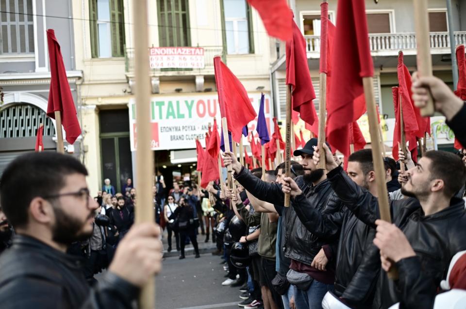 Ξεχωριστή πορεία πραγματοποίησε νωρίτερα το «μπλοκ» της ΠΑΣΠ με την αιματοβαμμένη σημαία του Πολυτεχνείου.