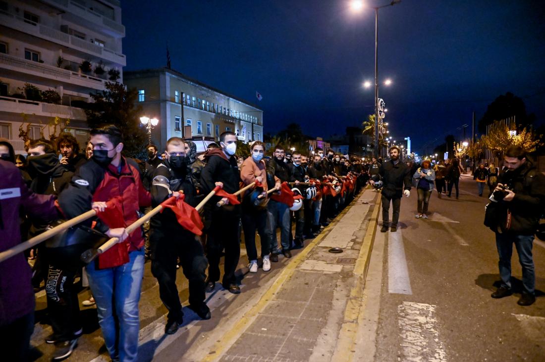 Ξεχωριστή πορεία πραγματοποίησε το «μπλοκ» με την αιματοβαμμένη σημαία του Πολυτεχνείου, μπροστά από την πρεσβεία των ΗΠΑ.