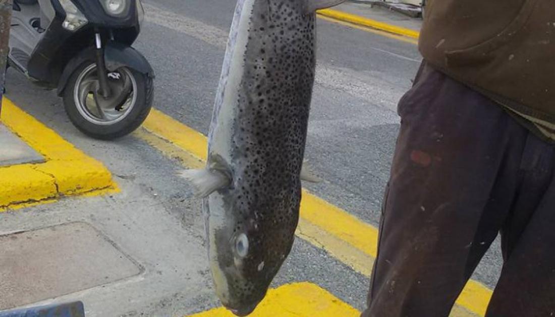 Ένας τεράστιος λαγοκέφαλος αλιεύτηκε στο λιμάνι του Ηρακλείου .