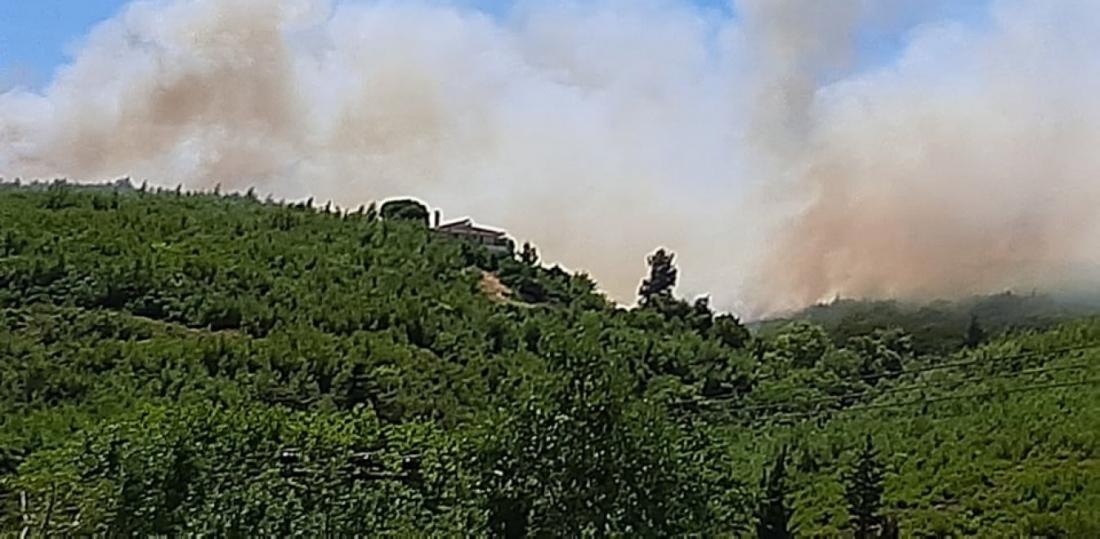 Η πυρκαγιά, σύμφωνα με την Πυροσβεστική, καίει δασική έκταση με πουρνάρια και πεύκα, νότια του χωριού, όπου υπάρχουν διάσπαρτα σπίτια, τα οποία δεν κινδυνεύουν από τη φωτιά, καθώς ο άνεμος φυσάει προς την αντίθετη κατεύθυνση.