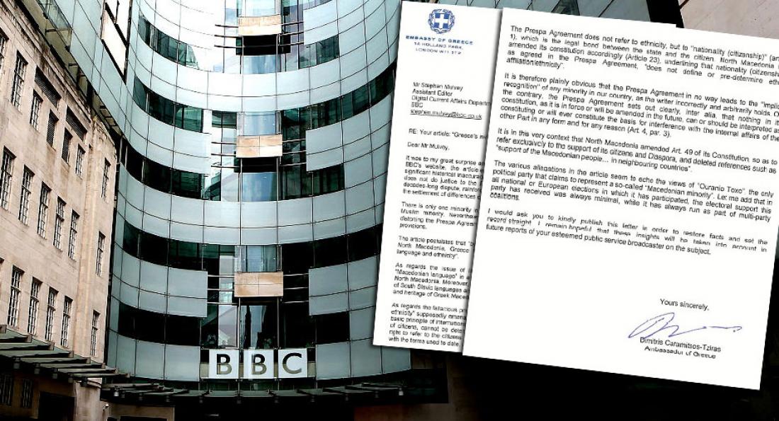 Ο Έλληνας πρέσβης στο Λονδίνο κ. Δημήτριος Καραμήτσος - Τζιράς, παρέδωσε επιστολή διαμαρτυρίας στο BBC, σχετικά με το προκλητικό δημοσίευμα που κάνει για «Αόρατη Σλαβομακεδονική μειονότητα» στην Ελλάδα.