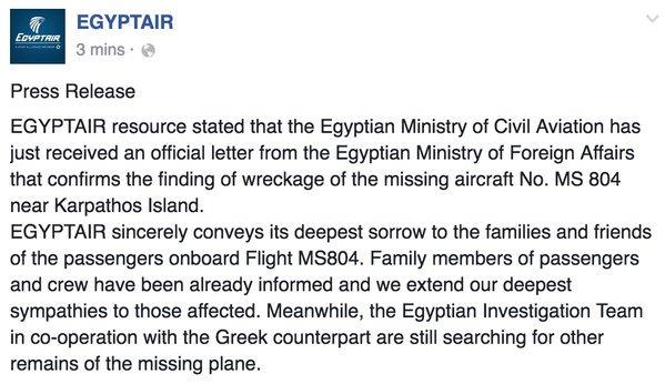 Αρχικά, η αιγυππτιακή εταιρεία αμφισβήτησε την πληροφορία ότι είχαν βρεθεί συντρίμμια σχετικά κοντά στην Κάρπαθο. Μάλιστα, με αυτόν τον τρόπο αμφισβήτησε εμμέσως την ελληνική κυβέρνηση. Στη συνέχεια όμως, με ανάρτησή της στο Twitter γνωστοποίησε πως βρήκαν συντρίμμια.
