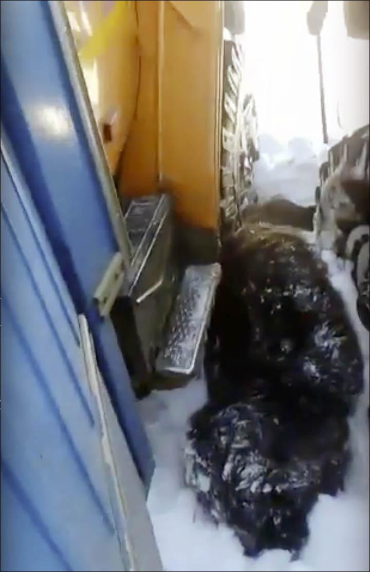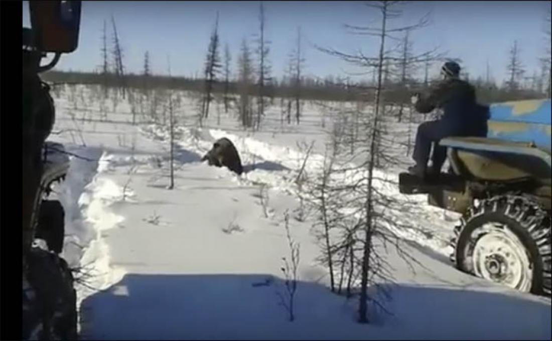 Το βίντεο τράβηξε ένας επιβάτης ενός οχήματος. Δείχνει δύο μεγάλα φορτηγά, τα οποία χρησιμοποιούνται συνήθως από πετρελαϊκές ή μεταλλευτικές εταιρείες στις ακραίες συνθήκες που επικρατούν στην περιοχή, να κυνηγούν μια αρκούδα που κινείται με δυσκολία στο χιόνι.