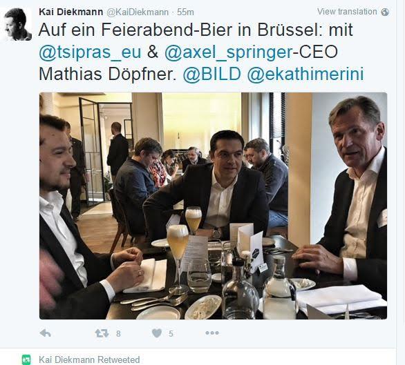 Για του λόγου το αληθές, τις φωτογραφίες από τη συνάντησή τους ανέβασε στο Twitter ο ίδιος ο εκδότης της Bild. Στο ίδιο τραπέζι και ο υπουργός Επικρατείας, Νίκος Παππάς.