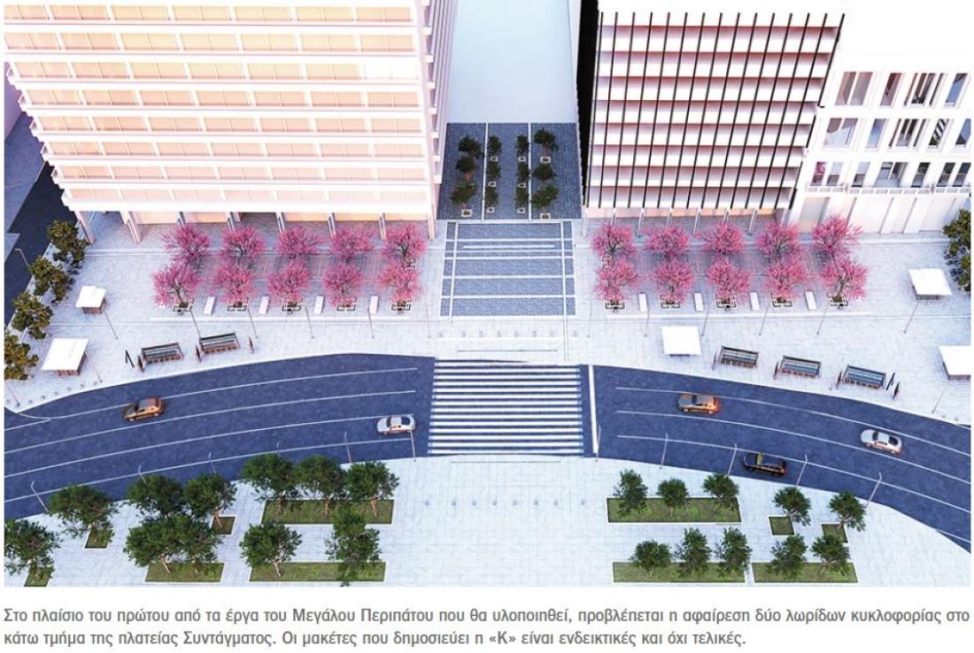 Η ανάπλαση του κάτω τμήματος της πλατείας Συντάγματος θα είναι το πρώτο από τα έργα του Μεγάλου Περιπάτου που θα υλοποιηθούν. Ο Δήμος Αθηναίων ανέθεσε στους νικητές του αρχιτεκτονικού διαγωνισμού που είχε πραγματοποιηθεί πριν από 20 χρόνια, στο πλαίσιο της ενοποίησης των αρχαιολογικών χώρων, να επικαιροποιήσουν τη μελέτη τους. Και σκοπεύει να ξεκινήσει τα έργα μέσα στο έτος, χρησιμοποιώντας υφιστάμενες εργολαβίες. Με την παρέμβαση, οι δύο από τις έξι λωρίδες κυκλοφορίας θα αντικατασταθούν με πεζοδρόμια από την πλευρά της οδού Ερμού, ενώ το σημείο θα αλλάξει πρόσωπο, αποκτώντας αισθητική εικόνα ανάλογη με αυτή της κεντρικής πλατείας.