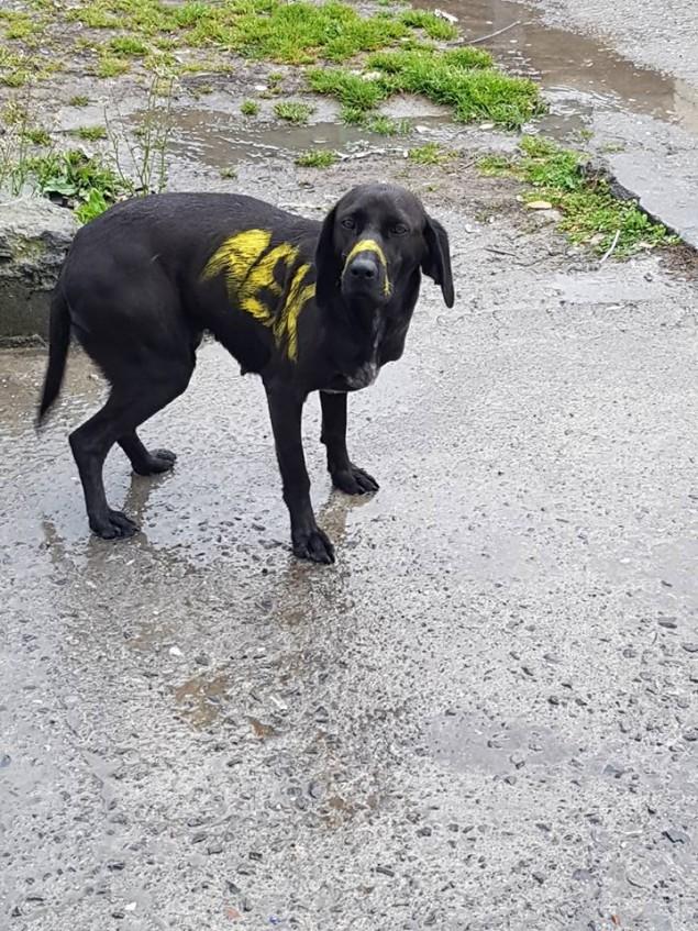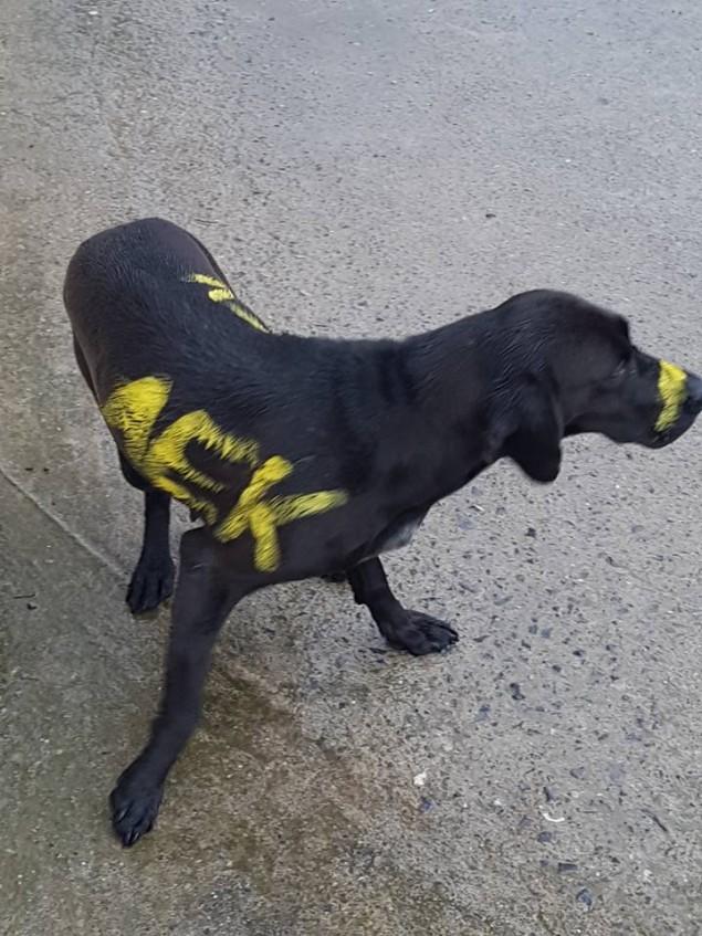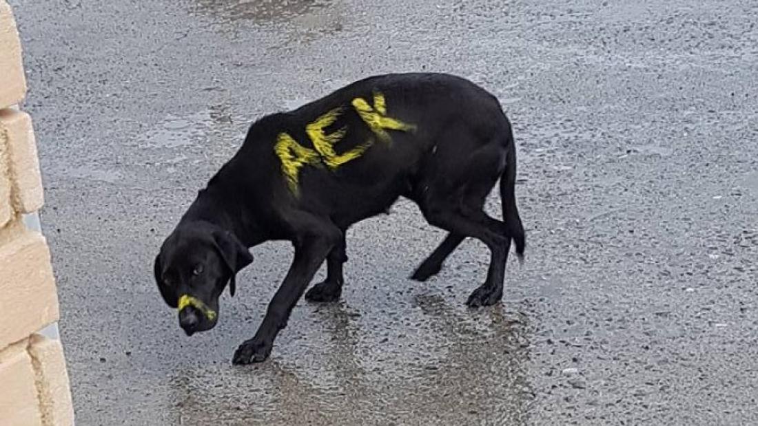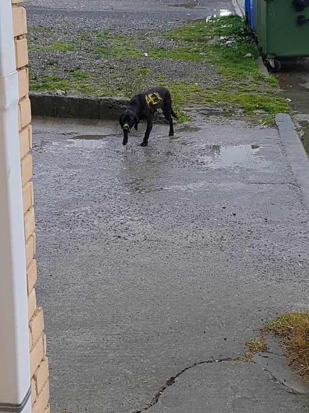 Ο μαύρος σκύλος της φωτογραφίας εντοπίστηκε να τριγυρίζει στην περιοχή της Μεγαλόπολης μόνος και φοβισμένος, έχοντας στο σώμα του σχεδιασμένο με σπρέι το όνομα της «ΑΕΚ».