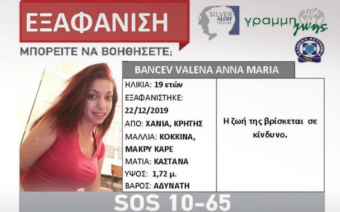 Συναγερμός έχει σημάνει στην Κρήτη με αφορμή την εξαφάνιση μιας 19χρονης. Συγκεκριμένα, αγνοείται η 19χρονη Άννα Μαρία Βαλένα Μπλάνσεβ, που εξαφανίστηκε στις 22 Δεκεμβρίου, από τα Χανιά της Κρήτης.