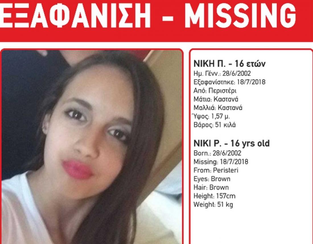 Αγωνία για τη 16χρονη Νίκη Π. που εξαφανίστηκε τις πρώτες πρωινές ώρες στις 18/7/2018 από το Περιστέρι.